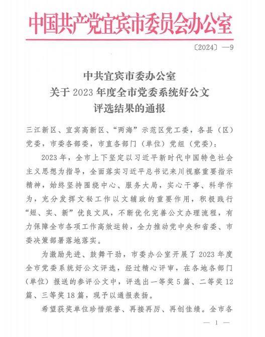 近日,中共宜賓市委辦公室印發(fā)了《關(guān)于2023年度全市黨委系統(tǒng)好公文評(píng)選結(jié)果的通報(bào)》,天原集團(tuán)黨委參評(píng)公文《中共宜賓天原集團(tuán)股份有限公司委員會(huì)關(guān)于下發(fā) <創(chuàng)建“原航”黨建品牌以一流黨建引領(lǐng)百年天原建設(shè)成為世界一流企業(yè)——天原集團(tuán)黨委爭創(chuàng)“長江首城黨建示范標(biāo)桿國企”方案〉的通知》(天原黨〔2023〕59號(hào))榮獲2023年度全市黨委系統(tǒng)好公文評(píng)選三等獎(jiǎng)。